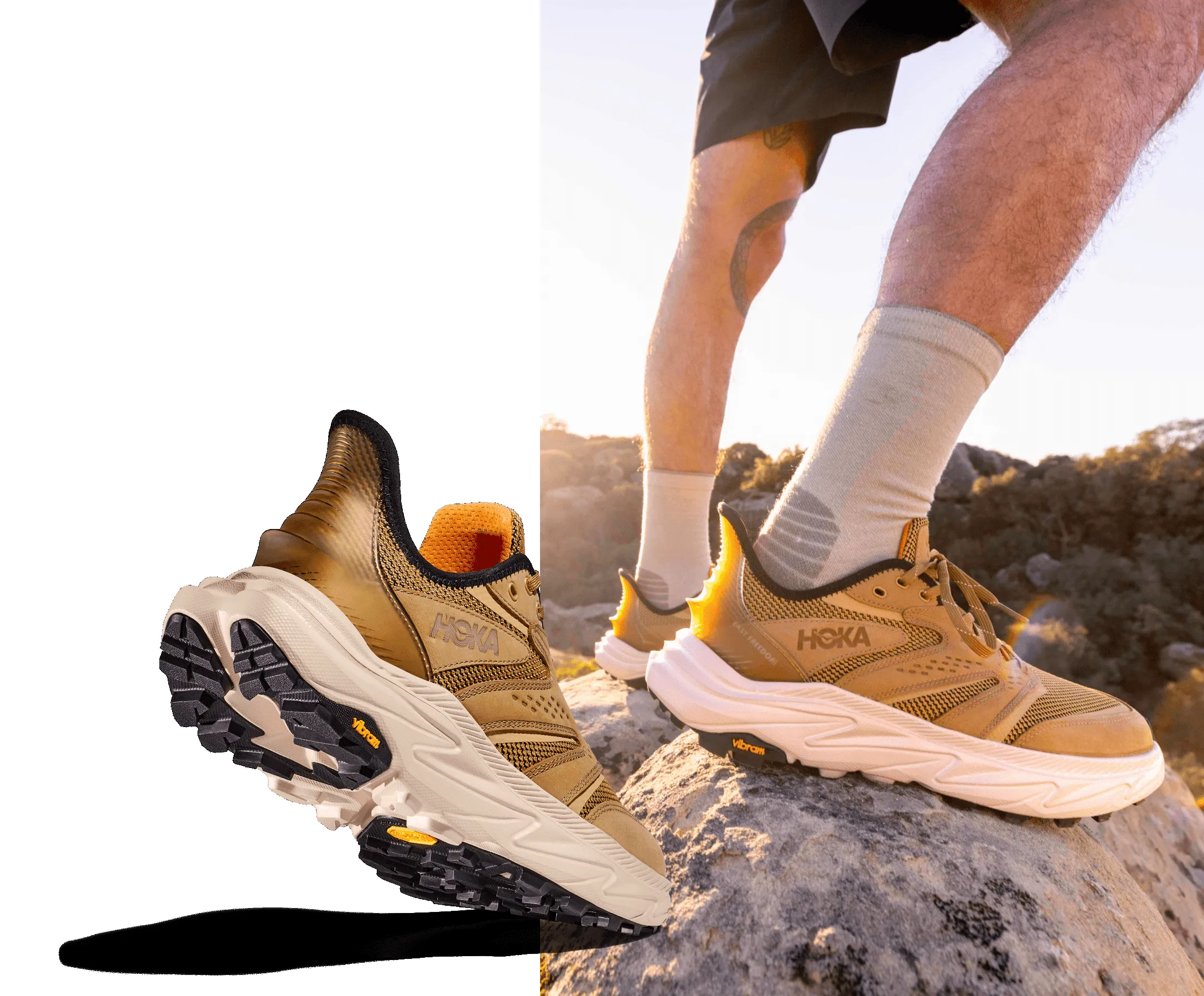 A slip-on designed for simple on-and-off, the Anacapa 2 Freedom paves the way for adventuring outdoors. A specially designed heel flexes and springs back for easy entry, working with the integrated tongue to make sliding in a breeze. HOKA geometry and a Vibram® Megagrip outsole keep this hiker adventure-ready while sustainable materials like 55% recycled polyester meshes, a soy-based PU sockliner, and 30% sugarcane EVA help it tread more lightly.